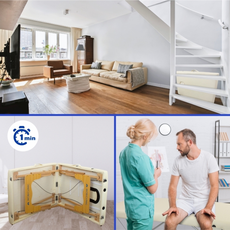 É dobrável, o que permite a sua utilização também por profissionais de saúde que trabalham em casa. Conta também com um sistema de dobragem e abertura automática.