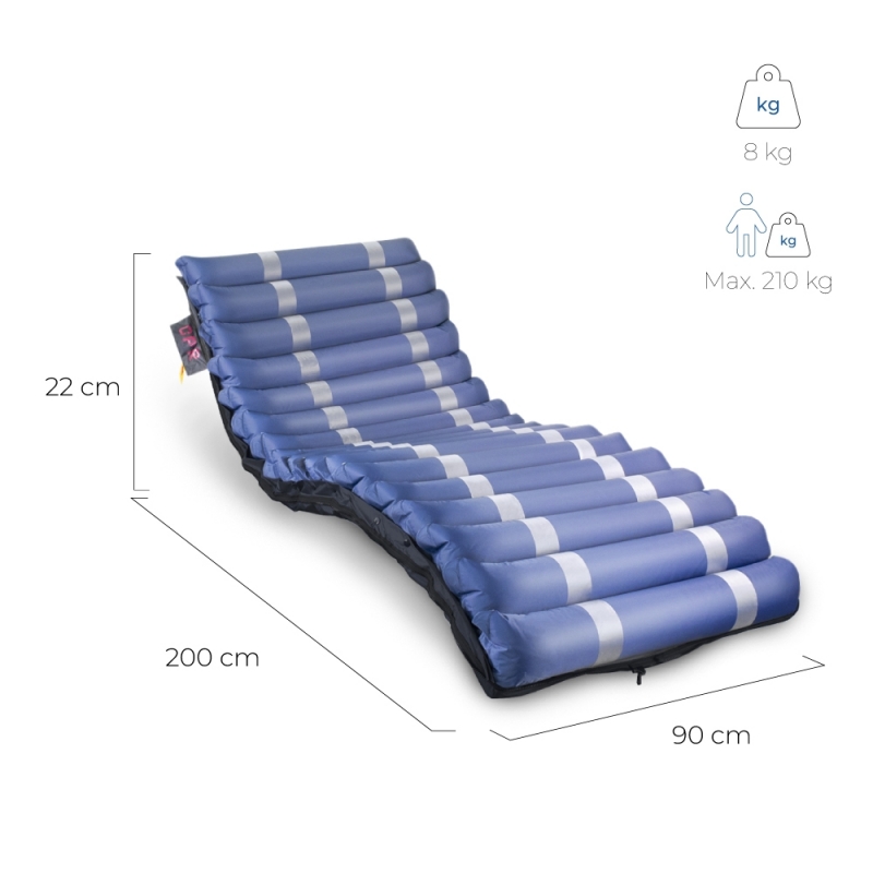 Adapta-se a qualquer cama; use-o em casa ou no hospital; ajudará você a descansar melhor. É muito fácil de instalar; estende-se sobre o colchão de ar do paciente, deixando os tubos aos pés da cama para conectá-los ao compressor silencioso incluído.