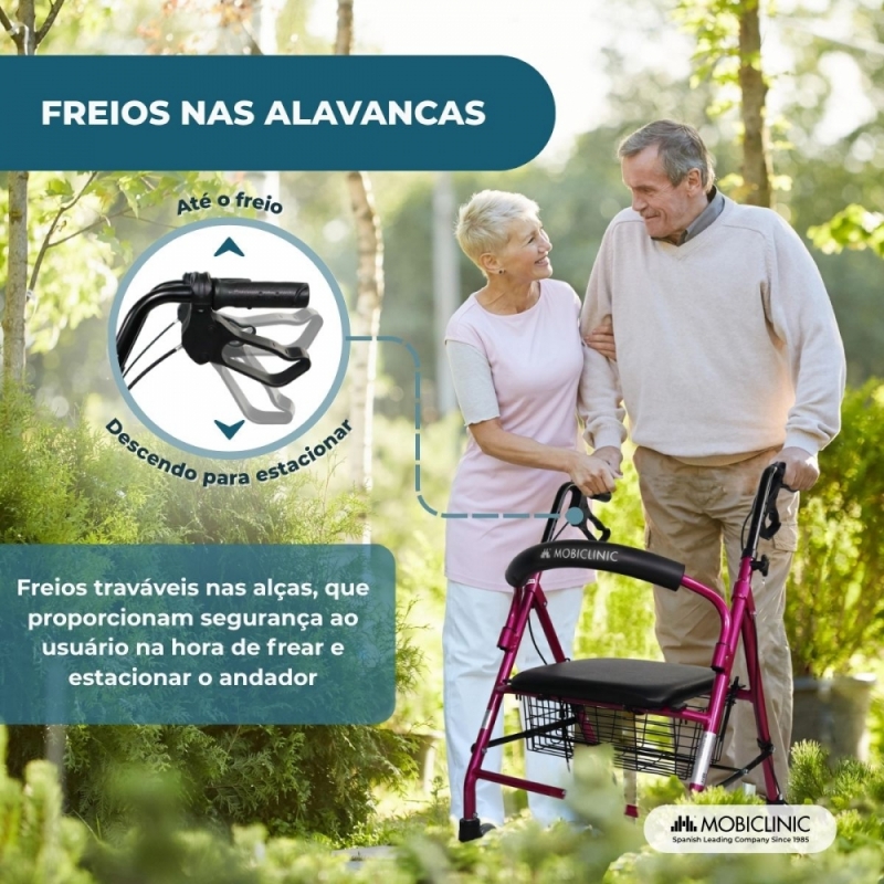 As alças do andador com assento são ergonômicas, ajudando a distribuir e amortecer o peso e reduzindo o cansaço durante o uso. Além disso, incluem travão acionados suavemente para parar o andador no momento desejado e sem esforço, além de oferecer a possibilidade de deixá-los travados para garantir a imobilização do andador, por exemplo, ao sentar-se no assento. Se precisar imobilizar completamente o andador, você deve puxar as alavancas do travão para baixo e as rodas serão travadas.