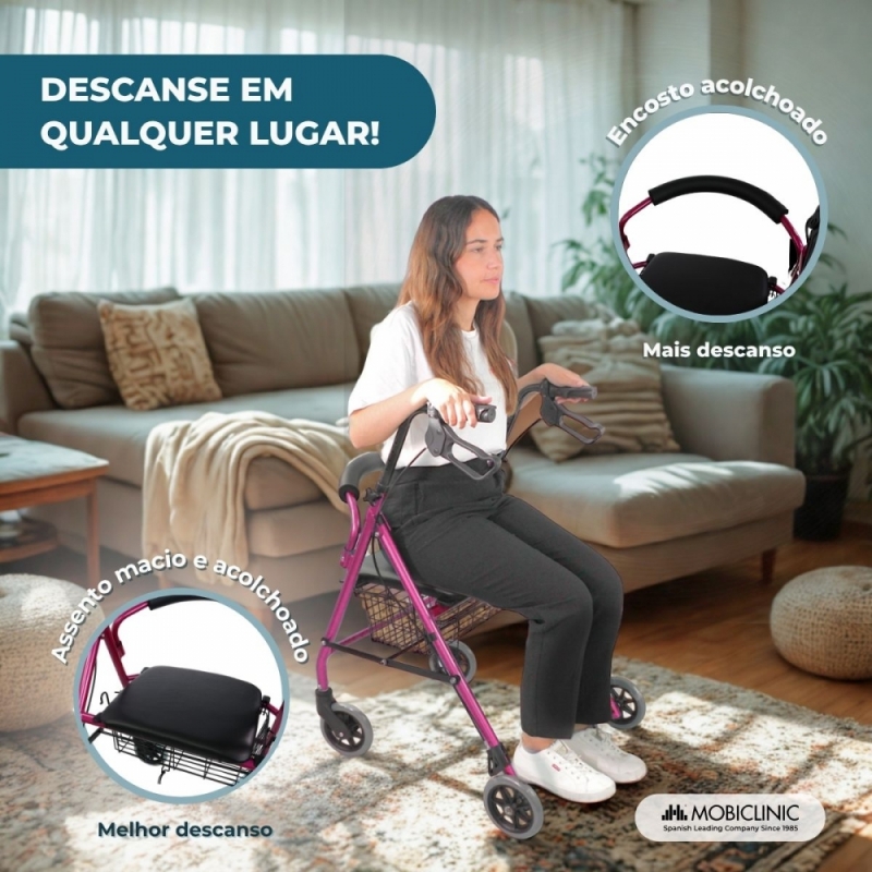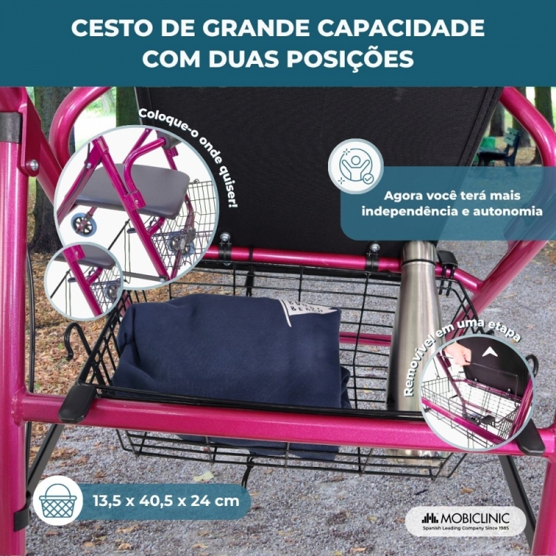 Este andador de alumínio possui assento e encosto acolchoados para garantir conforto e segurança, além de descanso adequado após o esforço. Inclui um cesto concebido para guardar os pertences com segurança e conforto enquanto caminha. Você pode posicioná-lo embaixo do assento e na frente do andador .