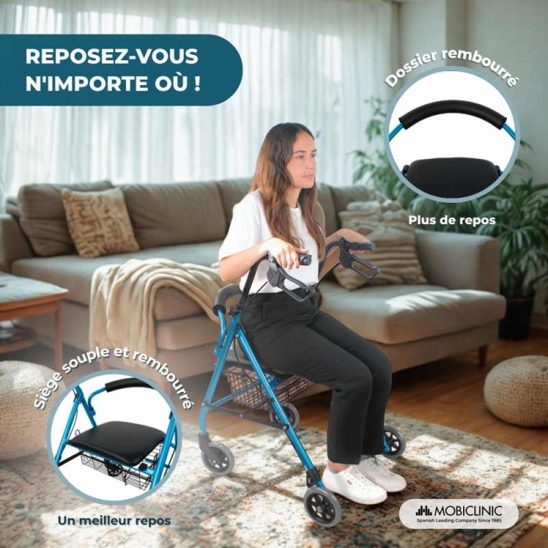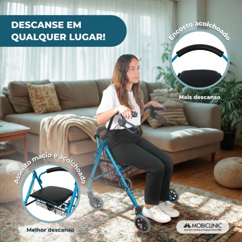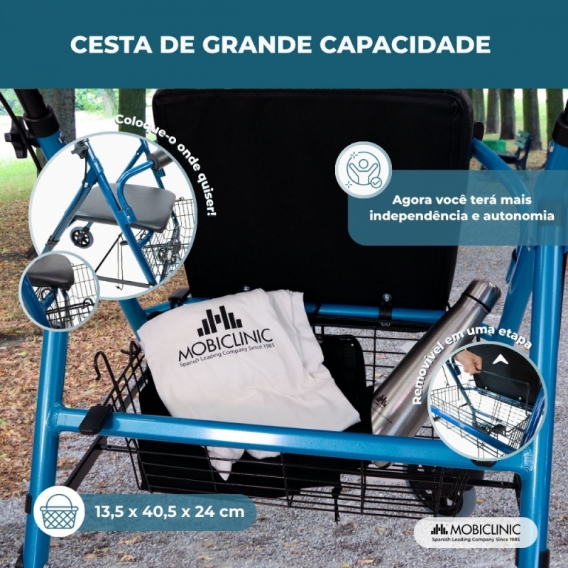 Este andarilho de alumínio possui assento e encosto acolchoados para garantir conforto e segurança, além de descanso adequado após os esforços. Inclui uma cesta projetada para guardar seus pertences com segurança e conforto enquanto caminha. Pode posicioná-lo sob o assento e na frente do andarilho .