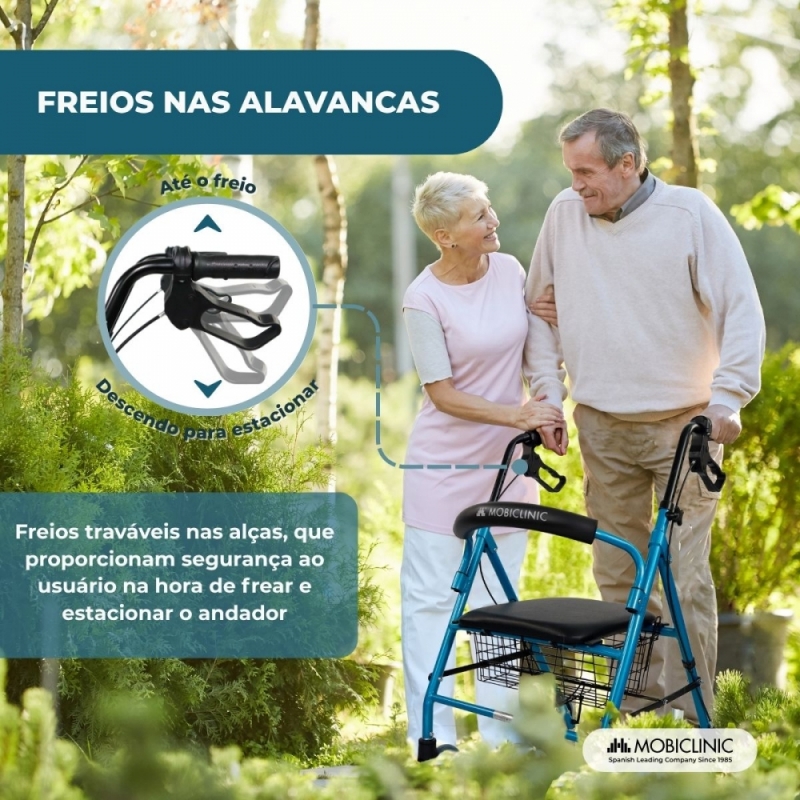 As alças do andarilho com assento são ergonômicas ajudando a distribuir e a amortecer o peso e reduzir o cansaço durante o uso. Além disso, incluem travão de ativação suaves para parar o andarilho no momento desejado e sem esforço, também oferece a possibilidade de deixá-los travados para garantir a imobilização do andarilho, por exemplo, ao sentar no assento. Se o andarilho precisar de ser completamente imobilizado, as alavancas do travão devem ser puxadas para baixo e as rodas travadas.