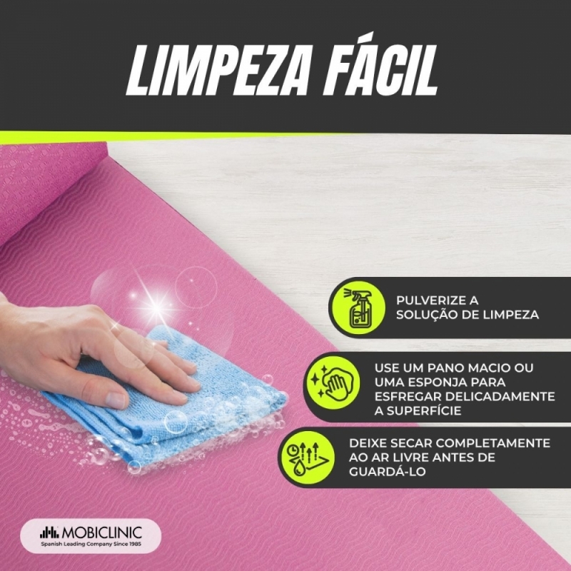 Terminado o exercício, este tapete é muito fácil de lavar, bastando apenas limpá-lo com um pano com água e sabão, enxaguar e finalmente secar com um pano seco. Dessa forma, você pode manter seu colchonete como primeiro dia.