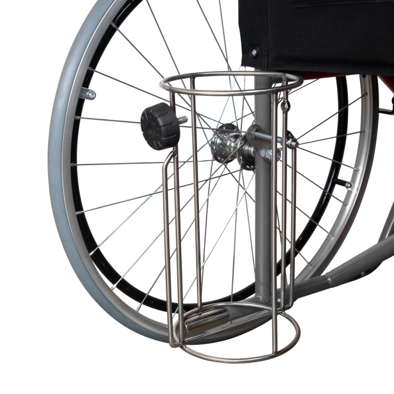 O suporte de oxigénio é um acessório que permite ao utilizador colocar o oxigénio na parte de trás da cadeira de rodas. É feito de aço cromado com um diâmetro interior de 15 cm.