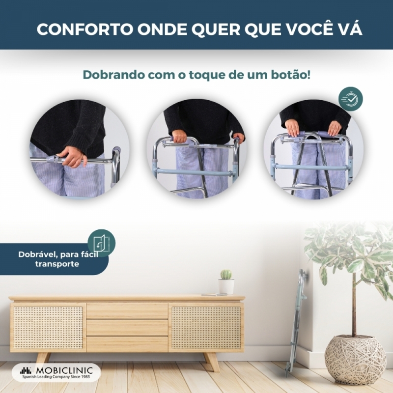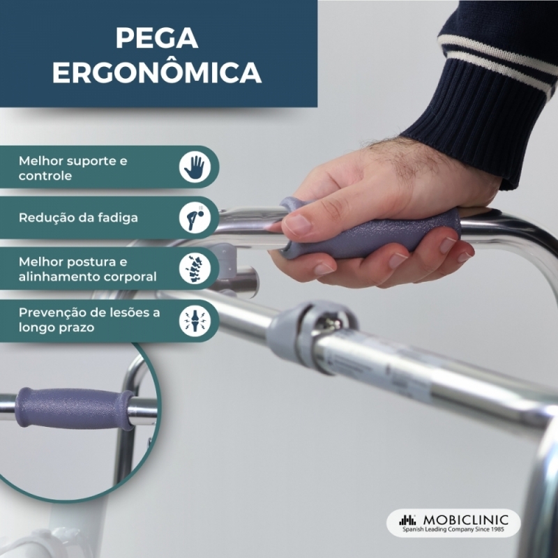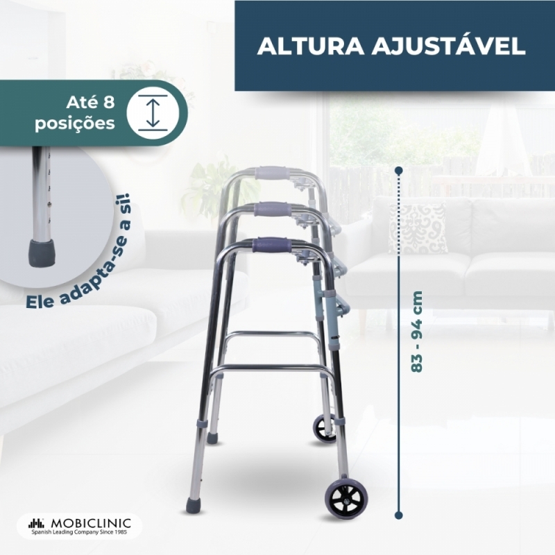 É regulável em altura, pelo que se adapta às necessidades de cada utilizador. Possui punhos ergonômicos que oferecem conforto e conveniência durante o uso. E tem um botão no chassis que permite dobrar o andador ortopédico quando necessário. Uma vez dobrado, pode ser guardado sem ocupar muito espaço.
