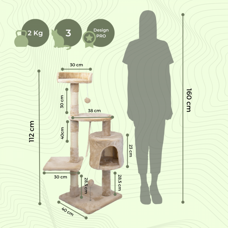 - Duas colunas elevadas: As colunas aperfeiçoam o desenho e adicionam á estrutura cordas de sisal para que o teu gato brinque e liberte o stress com elas.