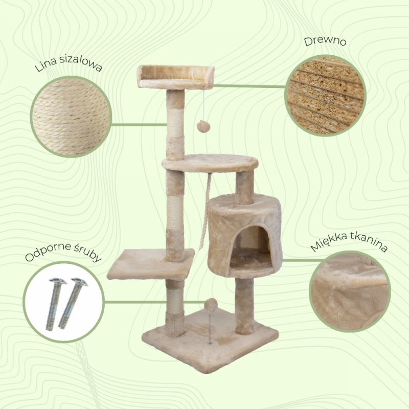 - Arranhador com casa para dormir e brincar: Um refúgio com entrada redonda conectado por uma coluna para que o teu gato possa disfrutar tanto da brincadeira como do relax.