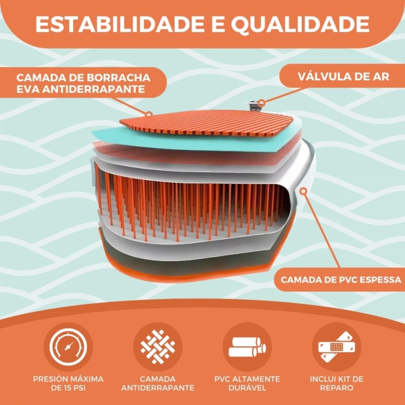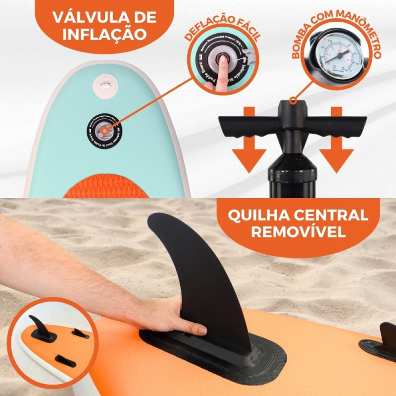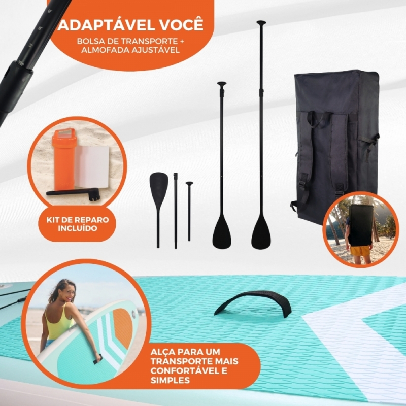 KIT COMPLETO: Nosso kit exclusivo oferece tudo que você precisa para mergulhar na emocionante experiência do paddle surf inflável . Da prancha aos acessórios essenciais como a bomba com manómetro e remo ajustável , reunimos tudo o que precisa para começar imediatamente a sua aventura aquática. Também inclui kit de reparo .