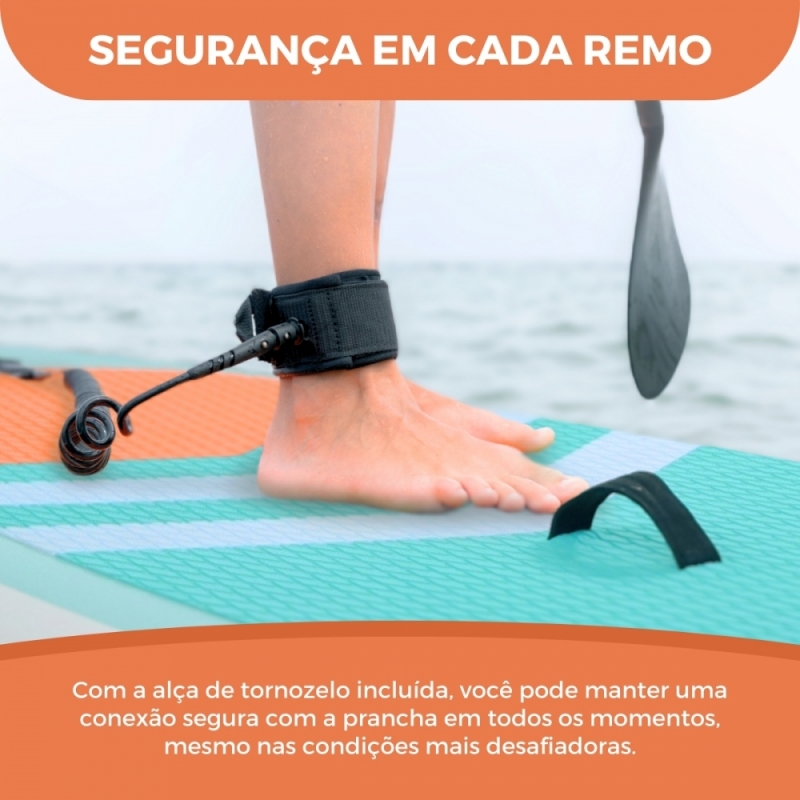 SEGURANÇA EM CADA PASSAGEM: Com a alça de tornozelo incluída, você pode manter uma conexão segura à sua prancha em todos os momentos, mesmo nas condições mais desafiadoras. A empunhadura mantém a prancha conectada em caso de queda ou capotamento , evitando que ela se afaste e podendo recuperá-la facilmente. Esse recurso não só proporciona segurança adicional, mas também permite que você se concentre em aproveitar a paisagem e aprimorar sua técnica.
