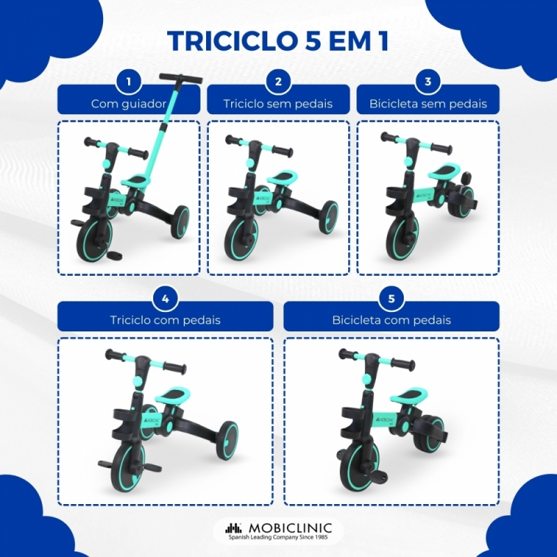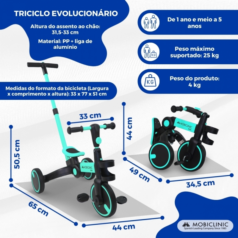 Triciclo 5 em 1 | Evolucionário | Guiador com assento ajustável | Máx. 25kg | Leve | 1 - 5 anos | Azul | Chase | Mobiclinic