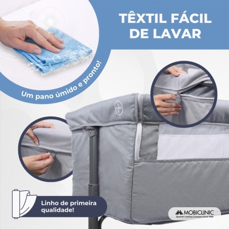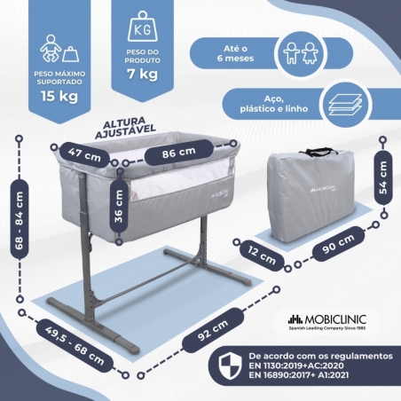 Consiste em uma estrutura estável e robusta e no próprio cesto, feito de tecido respirável para uma ventilação ideal, que é fácil de remover e lavar. O mini berço possui ajuste de altura em 5 posições para garantir acesso imediato ao bebê. Também possui uma janela de tela para manter a criança sempre à vista.