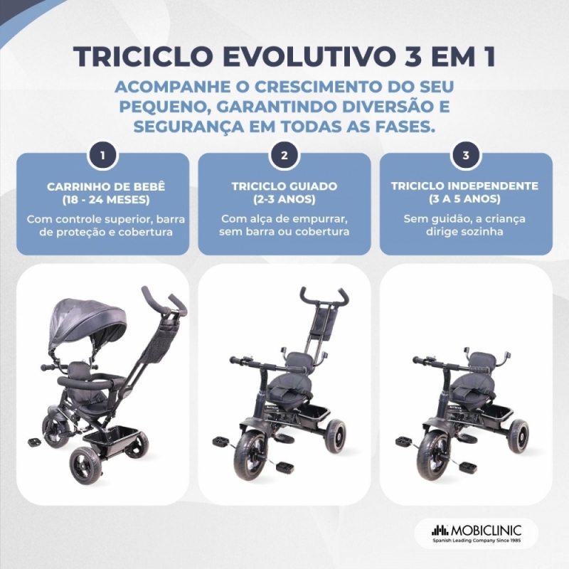 Seu design 3 em 1 permite: O Triciclo Evolutivo Mod LULU 3 em 1 se adapta ao crescimento da criança, oferecendo três modos de uso: