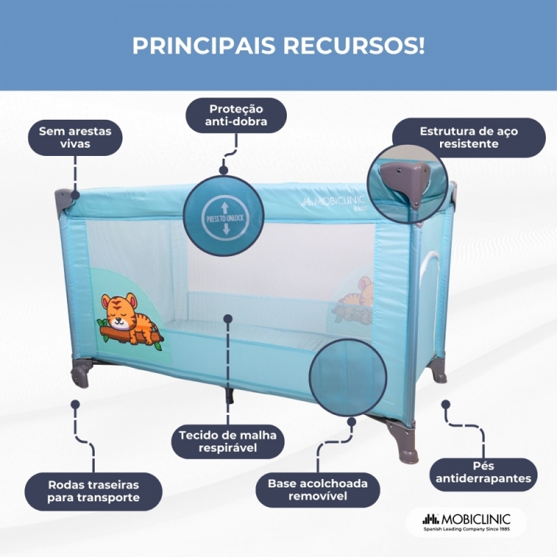 O berço portátil Mofli é composto por uma estrutura de aço resistente e um tecido respirável que permite a visão total do bebê, fácil de limpar com pano úmido. Funciona como cercadinho graças à sua altura fixa e ótima ventilação através da sua malha lateral. Além disso, a sua fácil dobragem permite que seja transportado para qualquer espaço sem problemas, se necessário. Também inclui uma base acolchoada removível.