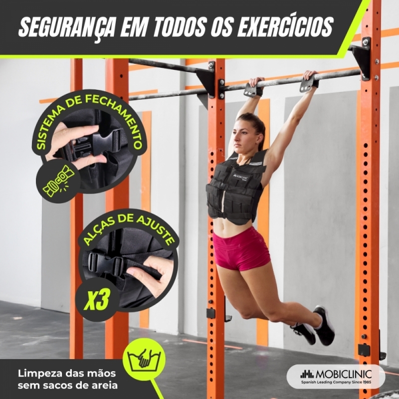 O colete possui elásticos laterais que se ajustam aos diversos tipos de corpo, proporcionando conforto e total mobilidade. Possui também ombreiras acolchoadas que proporcionam maior conforto e evitam possíveis danos por peso. A segurança é garantida graças ao seu sistema de fecho de três clipes que faz com que o colete permaneça fixo e estável durante qualquer exercício.