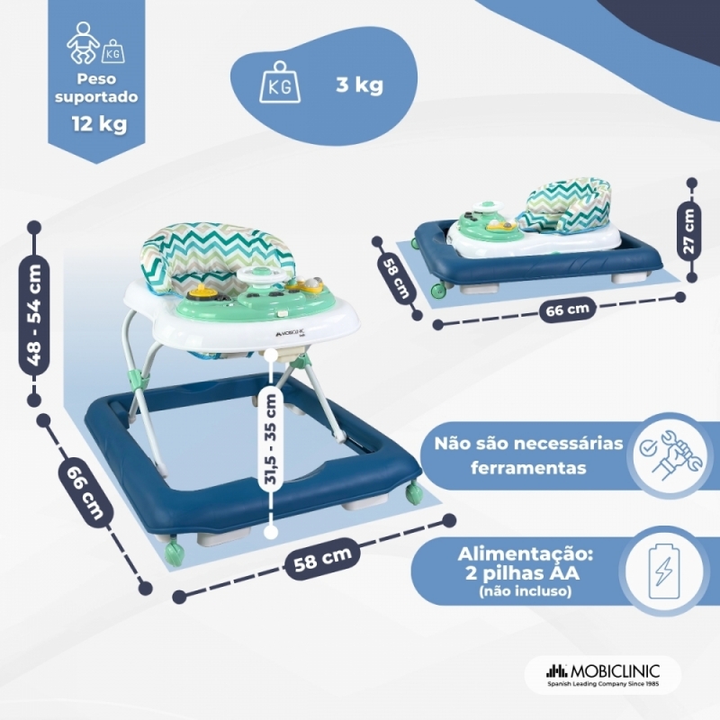 O andador é dobrável, facilitando o armazenamento e o transporte, ocupando um espaço mínimo quando não estiver em uso. A capa do assento é removível e lavável à mão, garantindo maior higiene para o bebê. Ele não só auxilia o bebê a aprender a andar, como também ajuda a fortalecer as pernas, melhorar o equilíbrio e promover o desenvolvimento sensorial por meio de brinquedos e música.