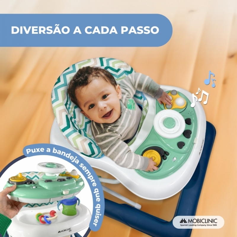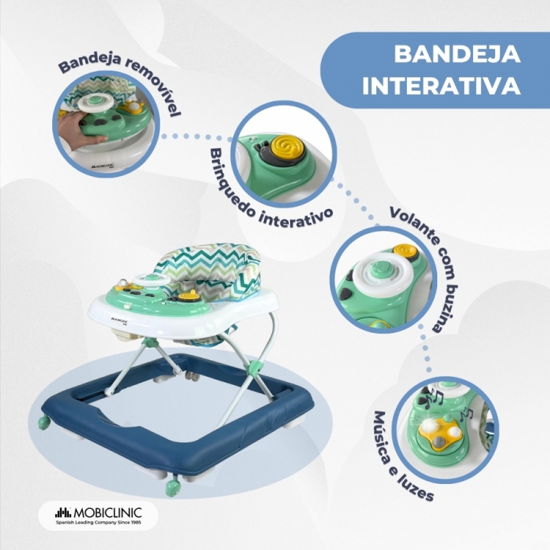 Possui uma bandeja interativa equipada com três brinquedos, luzes e música, mantendo o bebê entretido enquanto interage e explora. A bandeja é removível, permitindo que o bebê brinque com ela separadamente, oferecendo uma opção de diversão adicional.