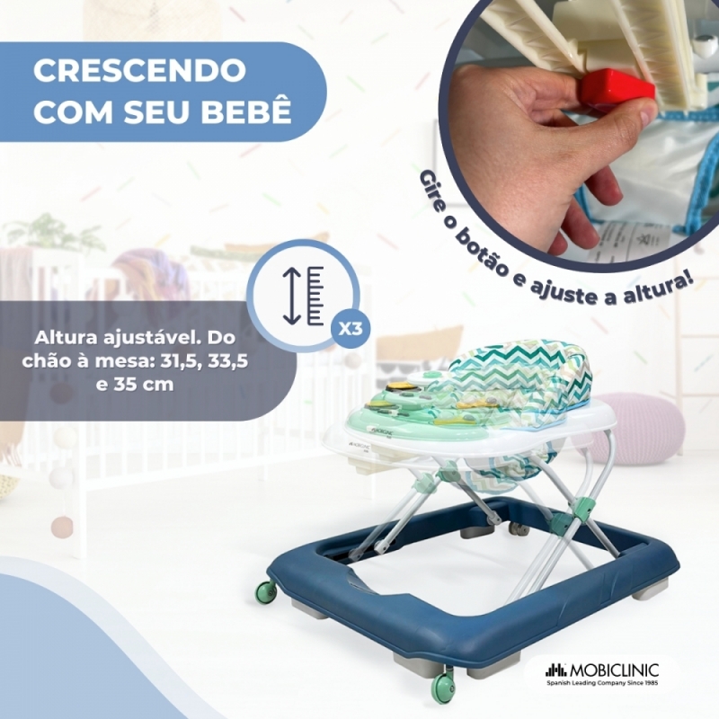 ALTURA AJUSTÁVEL: Projetado para acompanhar o crescimento do seu bebê, este andador possui 3 posições de altura ajustáveis, permitindo que se adapte ao seu desenvolvimento e garantindo uma postura correta e confortável em todos os momentos, promovendo sua segurança e ergonomia.