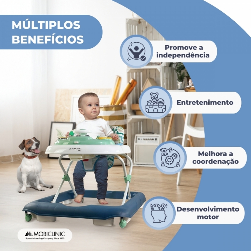FUNCIONALIDADE: Este andador foi projetado para ajudar os pequenos a darem seus primeiros passos com segurança e diversão. Graças à sua estrutura estável e de apoio, o bebê fortalecerá as pernas e melhorará a coordenação motora enquanto se movimenta. Sua base garante movimentos equilibrados, evitando que tombe e proporcionando segurança.
