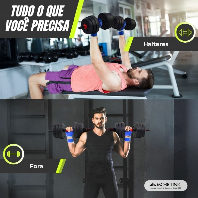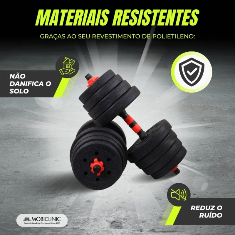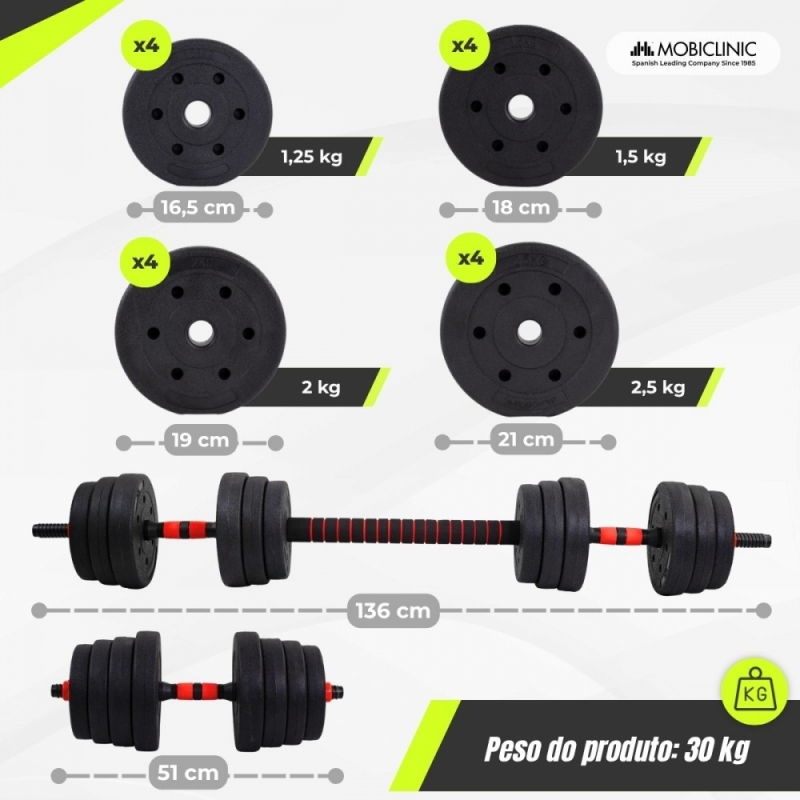 Este conjunto foi projetado pensando em funcionalidade, segurança e conforto. Seu peso total é de 30 kg (29 kg de discos + 1 kg de acessórios), permitindo que você personalize seu treino adicionando ou removendo discos facilmente, de acordo com suas necessidades. Além da funcionalidade, este conjunto se destaca pelo design compacto e fácil de guardar, que ocupa pouquíssimo espaço, ideal para treinar em casa ou em viagens.