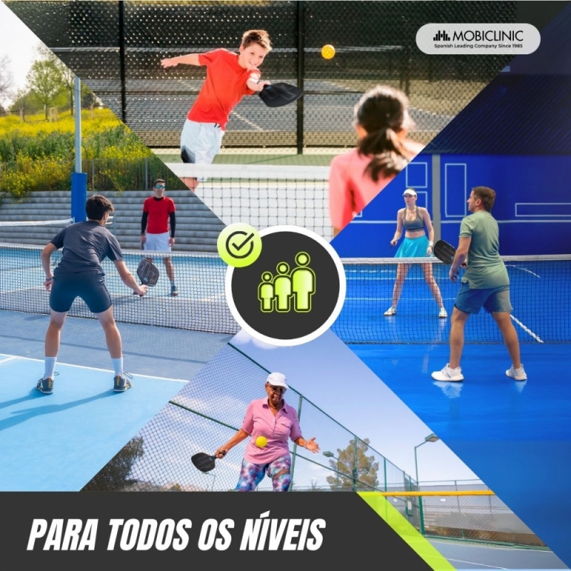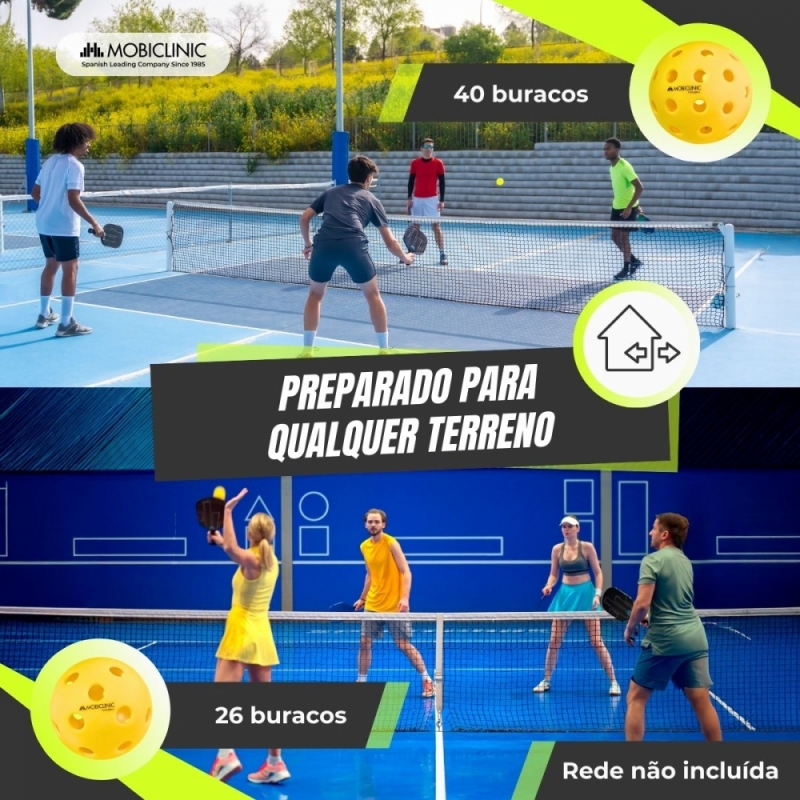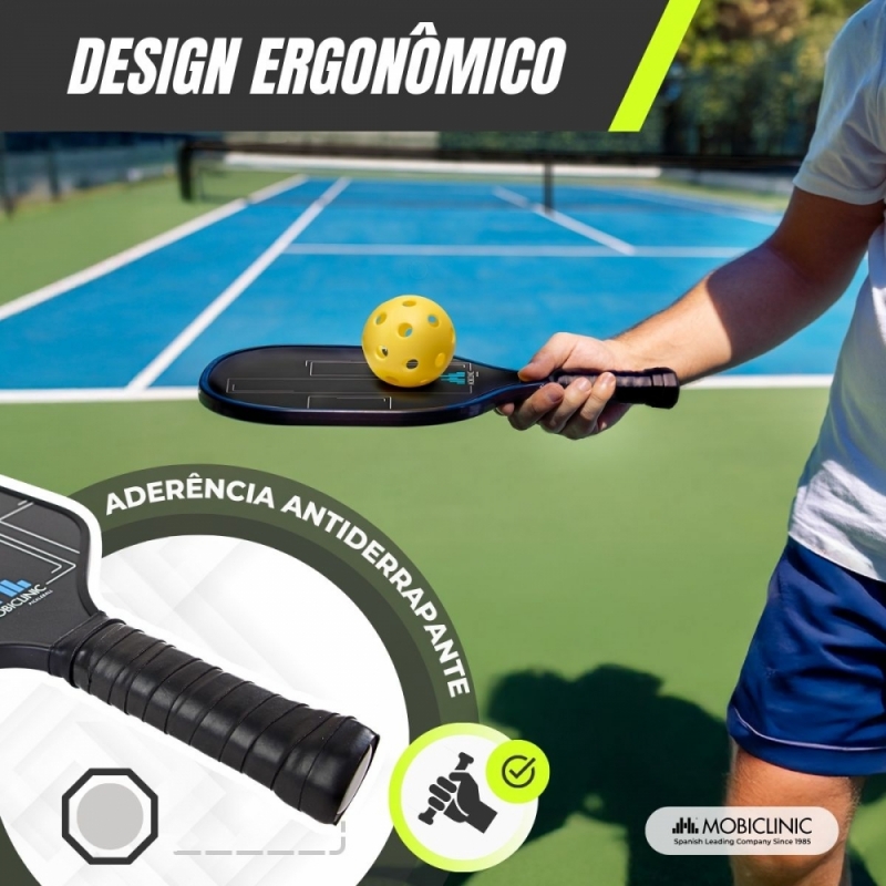 O conjunto Mobiall Pickleball é a escolha perfeita tanto para iniciantes quanto para jogadores experientes que buscam uma atividade física completa e divertida. Inclui quatro raquetes feitas de fibra de vidro com núcleo de polímero em formato de colmeia, um material que oferece uma combinação de controle e potência durante o jogo. Suas alças ergonômicas com empunhadura antiderrapante e absorvente garantem uma pegada confortável.