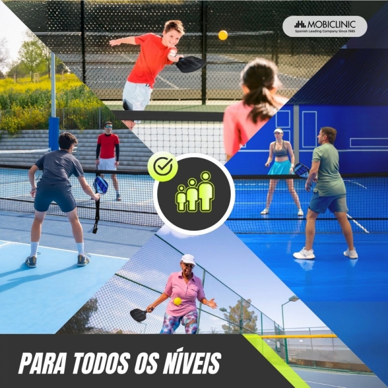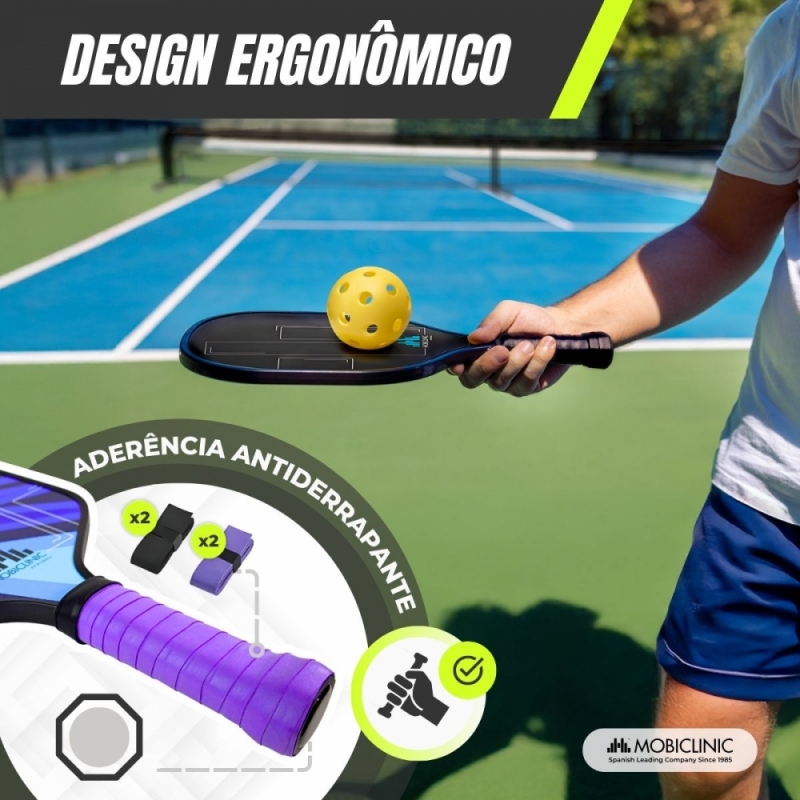 O conjunto Mobiall Pickleball é a escolha perfeita tanto para iniciantes quanto para jogadores experientes que buscam uma atividade física completa e divertida. Inclui quatro raquetes feitas de fibra de vidro com núcleo de polímero em formato de colmeia, um material que oferece uma combinação de controle e potência durante o jogo. Suas alças ergonômicas com empunhadura antiderrapante e absorvente garantem uma pegada confortável.