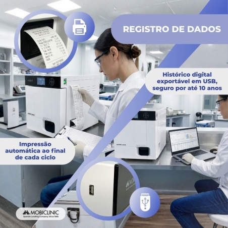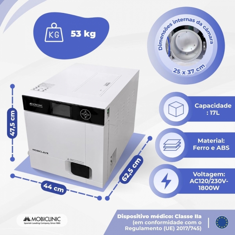 A autoclave esterilizadora Mobiclinic de 17 litros foi projetada para oferecer esterilização completa, profissional e segura, adaptando-se às demandas de múltiplos setores, como clínicas odontológicas, centros médicos, laboratórios, ortopedia ou clínicas veterinárias.
