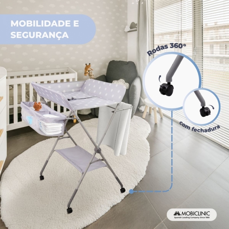 PRÁTICO E ESTÁVEL: Possui quatro rodas giratórias de 360 graus que permitem mobilidade sem esforço em qualquer espaço. Elas também possuem freios individuais que mantêm o trocador no lugar durante o uso, garantindo estabilidade e evitando movimentos inesperados.
