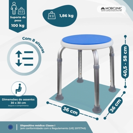 O banco de chuveiro Foco foi projetado para garantir segurança, autonomia e conforto no banheiro. Seu botão ajustável permite ajustes rápidos e sem ferramentas em oito alturas, variando de 40 a 57,5 cm. Essa faixa de ajuste permite personalizar a posição do assento, facilitando uma higiene mais confortável e personalizada para cada usuário.