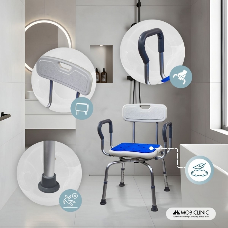O banco de banho giratório Akila oferece conforto e segurança no chuveiro e para a higiene pessoal, sendo ideal para idosos, pessoas em reabilitação ou com mobilidade reduzida. Graças ao seu assento giratório, você pode fazer movimentos suaves e seguros sem precisar torcer o corpo, reduzindo o risco de quedas ou lesões. Ele incorpora um sistema de travamento de segurança que impede movimentos indesejados e proporciona maior estabilidade ao usuário durante o uso.