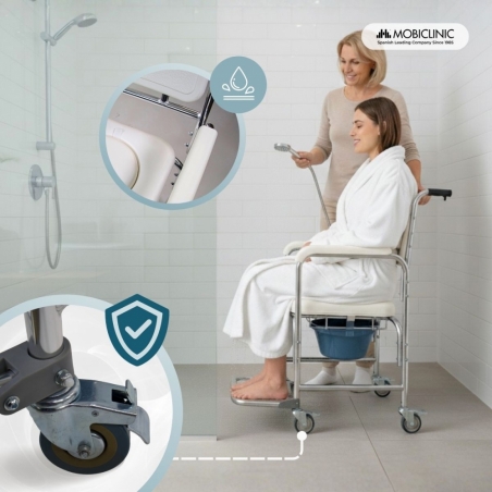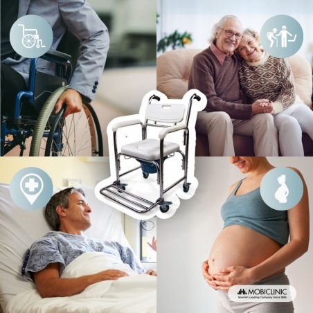É versátil e pode ser usada como cadeira sanitária, cadeira de banho, elevador de assento de vaso sanitário e cadeira de transferência, adaptando-se às necessidades de todos os usuários. Possui freios nas quatro rodas para maior segurança e para evitar movimentos involuntários.