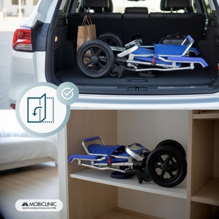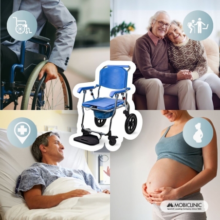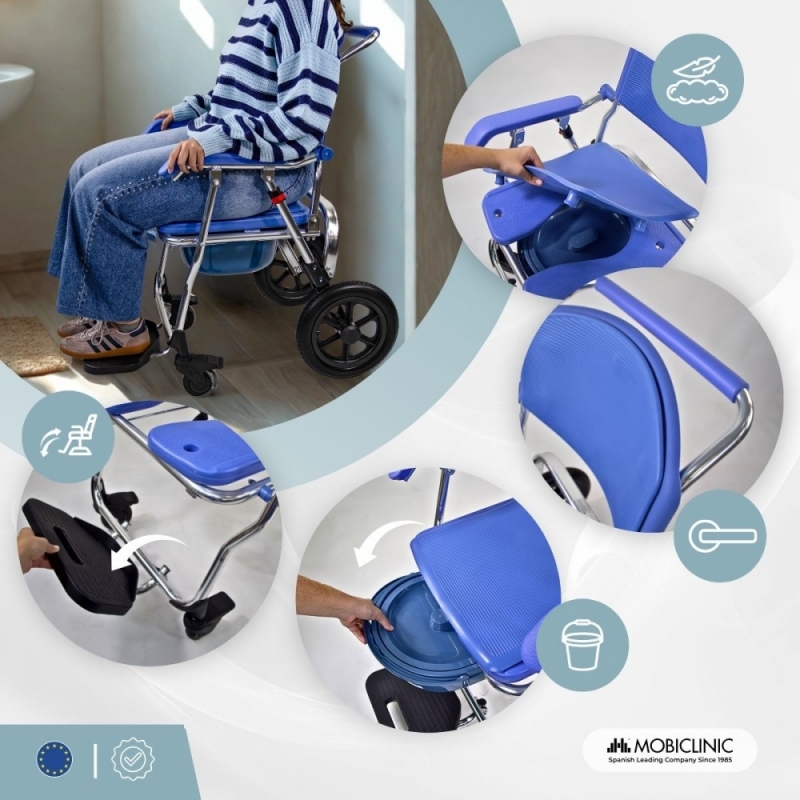 Seu design dobrável facilita o armazenamento e o transporte da cadeira. Ela pode ser guardada sem ocupar muito espaço e movida facilmente de um cômodo para outro, sendo ideal para casas de repouso, residências e hospitais. Sua estrutura foi projetada principalmente para facilitar as tarefas diárias, reduzindo movimentos bruscos e posturas inadequadas.