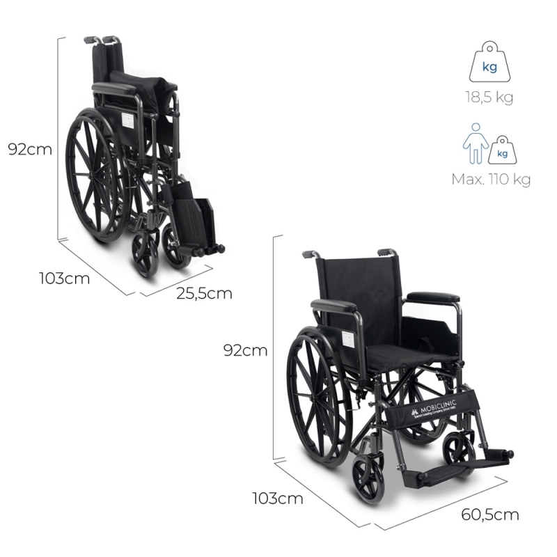 - A cadeira de rodas é dobrável para facilitar o transporte e armazenamento.