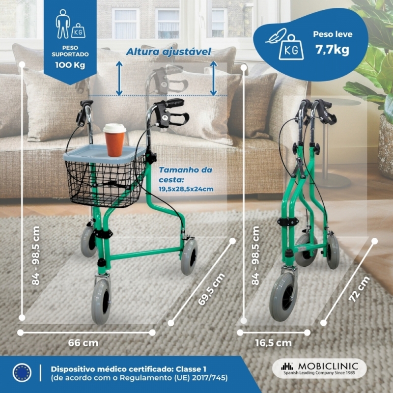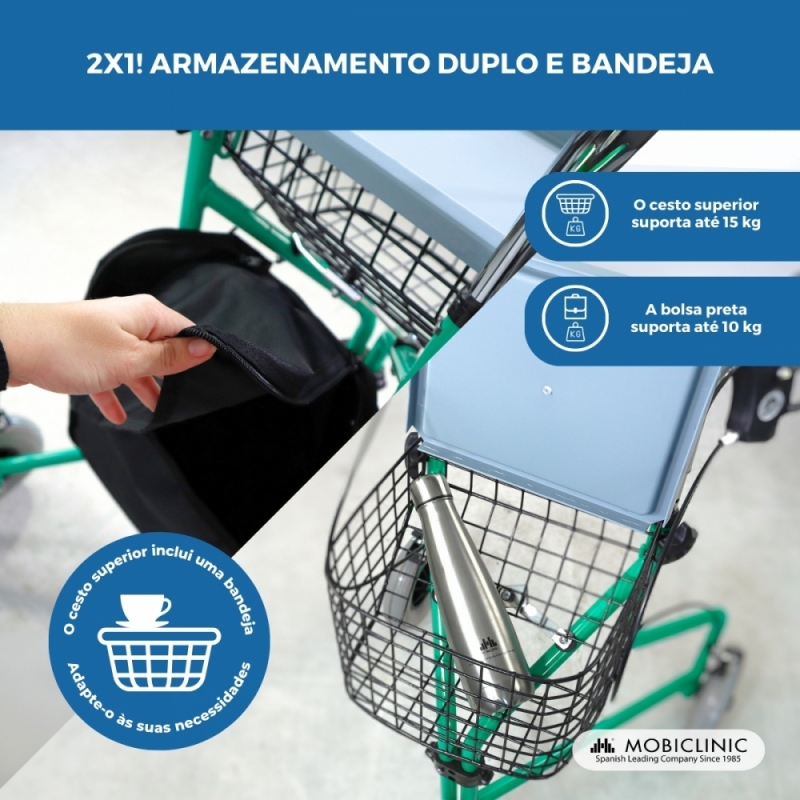 O design do andador ortopédico é funcional e moderno, contém uma prancha e um grande cesto fixo que permite guardar objetos, além de uma grande bolsa traseira. Este andador dobrável permite fácil transporte e armazenamento. Tem apenas 16,5 cm de largura quando dobrado.