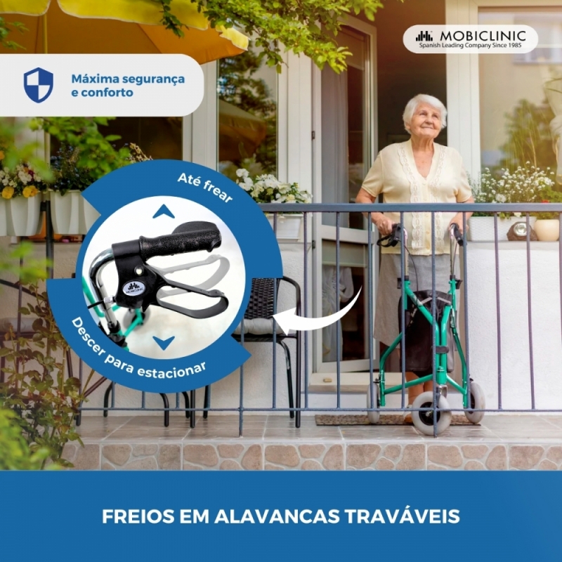 Este andador para idosos possui alças ergonômicas para maior conforto que ajudam a distribuir e amortecer o peso . Também inclui travão nas alças para parar ou bloquear o andador de forma segura e natural.