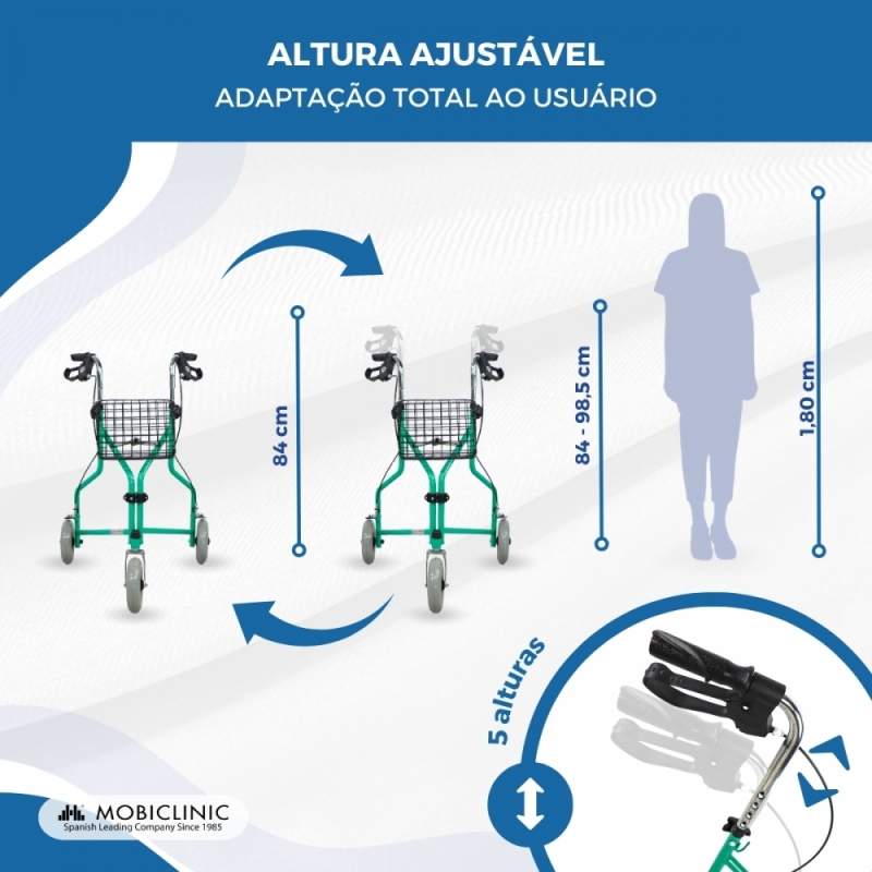 Você pode usar este andador para adultos tanto em ambientes internos quanto externos, graças às suas três rodas grossas e estrutura de aço leve, que permitem movimentos fáceis e sem esforço. Sua altura é ajustável para se adaptar às necessidades de cada usuário.