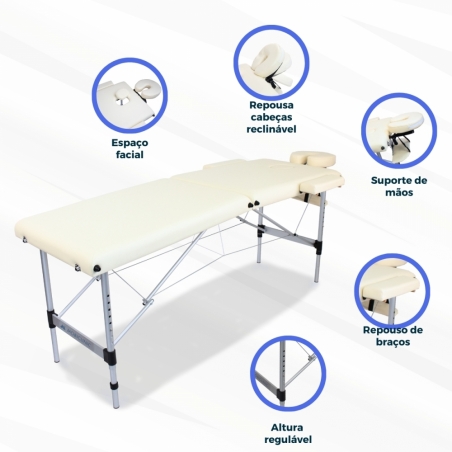 É uma mesa de massoterapia ajustável em altura através das pernas, tendo vários níveis para adaptá-lo ao que é mais confortável para você.
