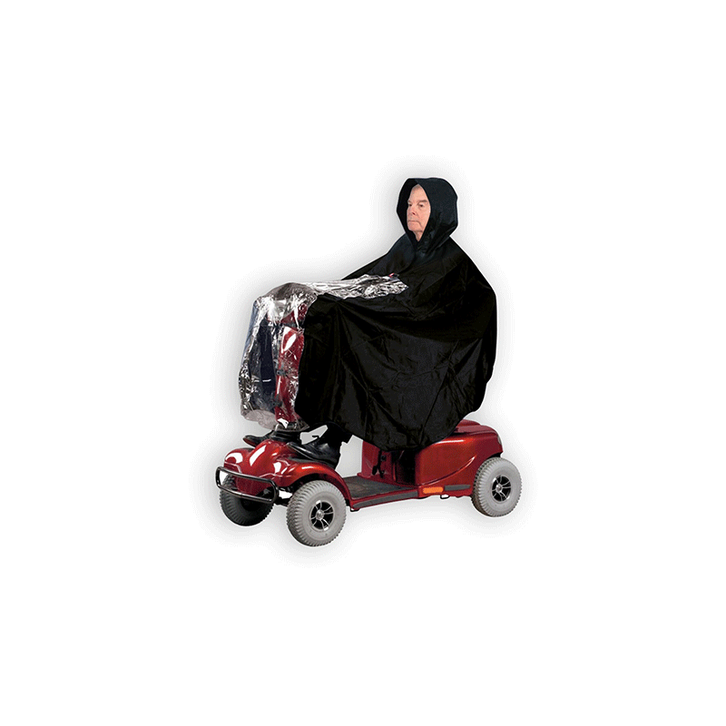 Capa de chuva tipo poncho para scooters e cadeiras de rodas elétricas com capuz ajustável e viseira.