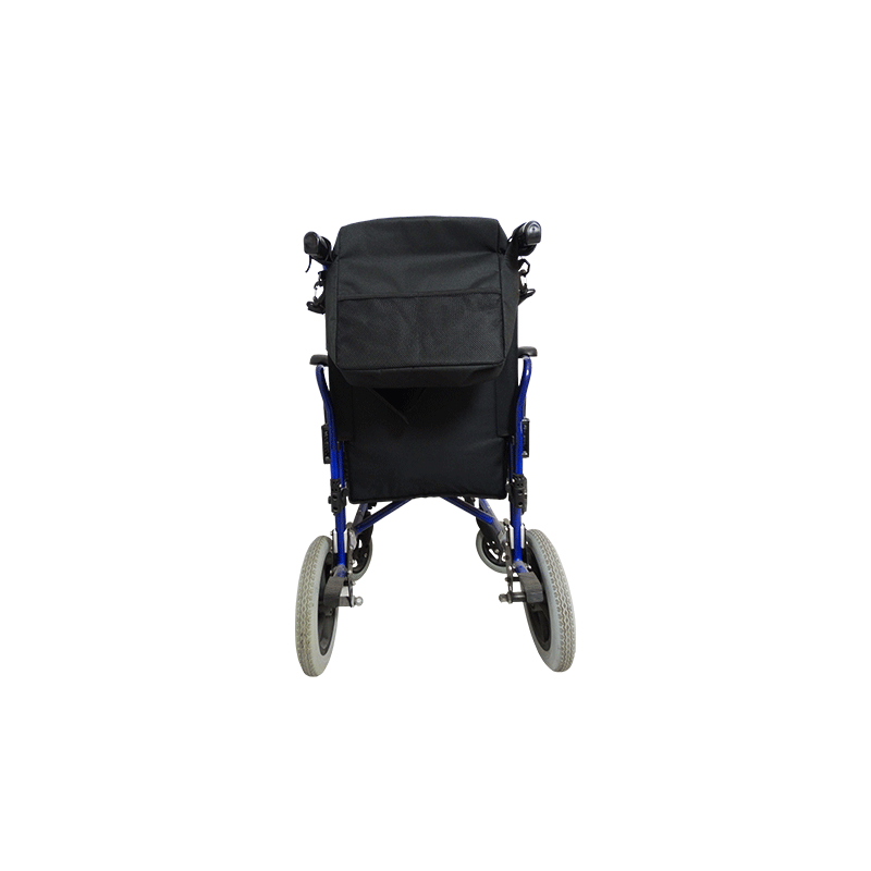 Bolsa para cadeira de rodas com alça para carregar no ombro. Ajustável com 2 tiras de velcro. 3 bolsos no lado principal da bolsa, 1 bolso com zíper e 2 bolsos nas costas da bolsa de malha.
