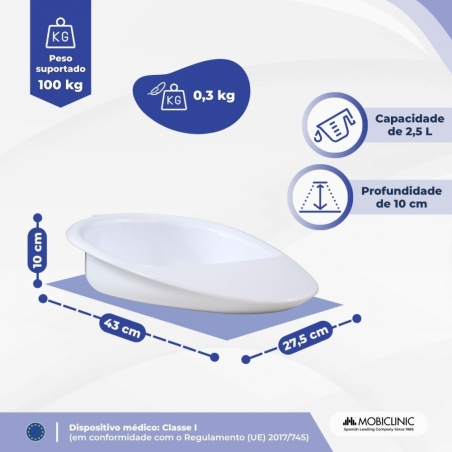 GRANDE CAPACIDADE: Esta comadre tem capacidade para 2500 ml, evitando transbordamentos e permitindo uso prolongado sem necessidade de esvaziamento imediato. Isso proporciona maior conforto tanto para o paciente quanto para o cuidador.