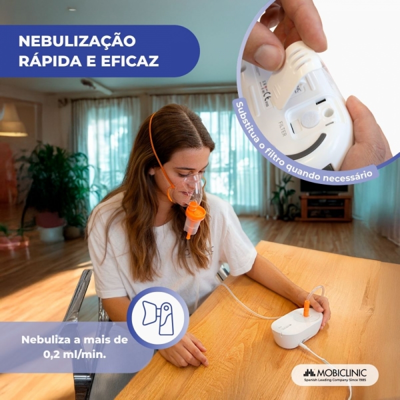 Oferece uma taxa de nebulização superior a 0,2 ml/min e opera em ciclos de até 20 minutos, seguidos por um período de descanso de 40 minutos, garantindo sessões confortáveis e evitando superaquecimento. Além disso, é muito silencioso graças à sua tecnologia de ar comprimido.