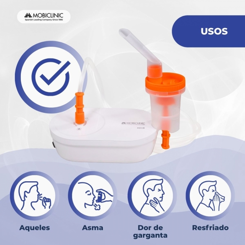 Seu design compacto e leve facilita o armazenamento e o transporte. Seu funcionamento é simples, conectando-se à rede via USB. Em relação à higiene, suas peças são fáceis de desmontar, facilitando a limpeza. O copo medidor e o bocal são desinfetados por fervura, enquanto as máscaras podem ser desinfetadas com álcool. O tubo de ar precisa apenas ser enxaguado e seco com um pano.