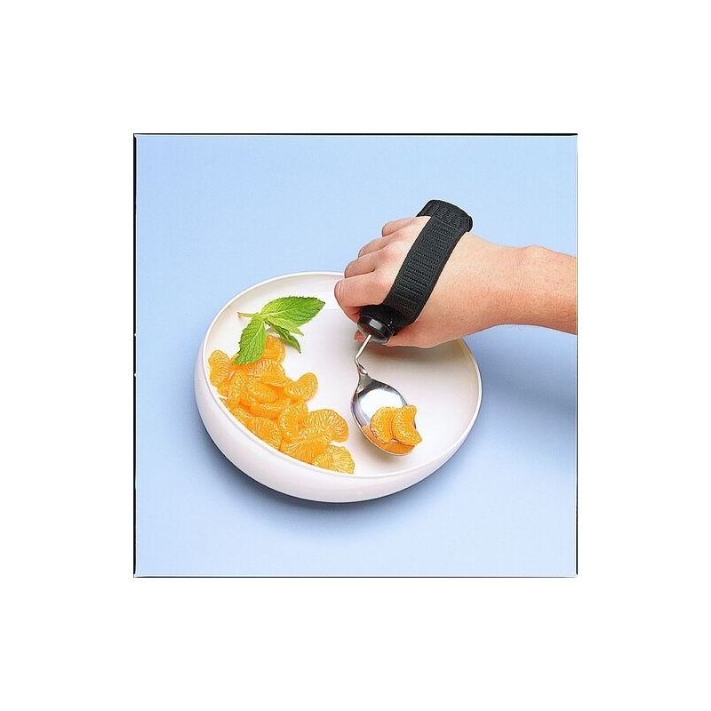 Para o seu uso correto, unicamente tem de colocar a mão no utensílio e ajustar a cinta de velcro à medida da mão do paciente, para garantir assim um agarre seguro que evite que o talher caia.