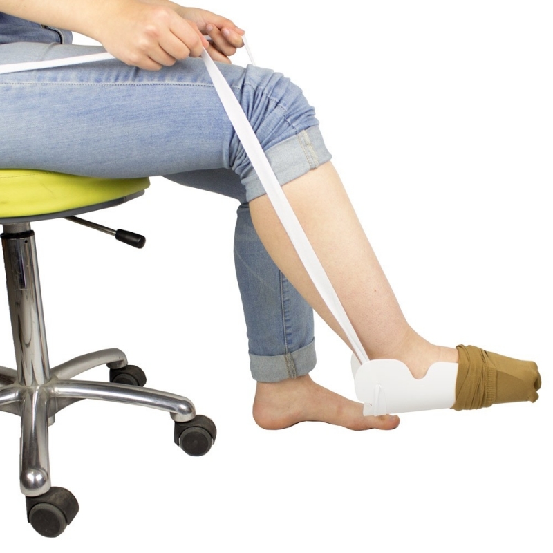 Calçador leve, económico e flexível para ajudar uma pessoa com dificuldades de mobilidade a vestir meias, peúgas ou collants sem ter de dobrar a cintura ou a anca.