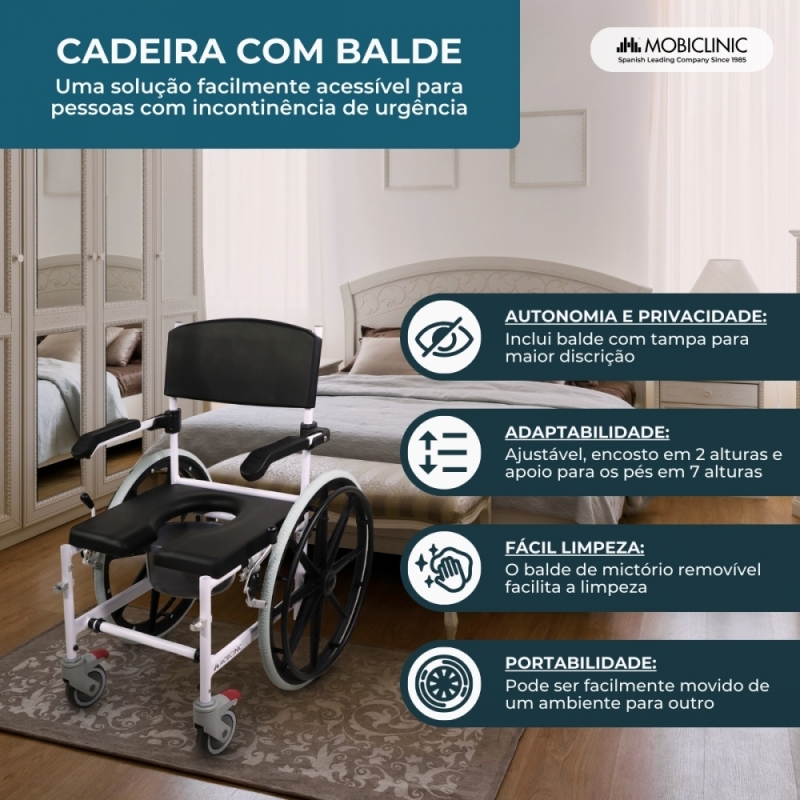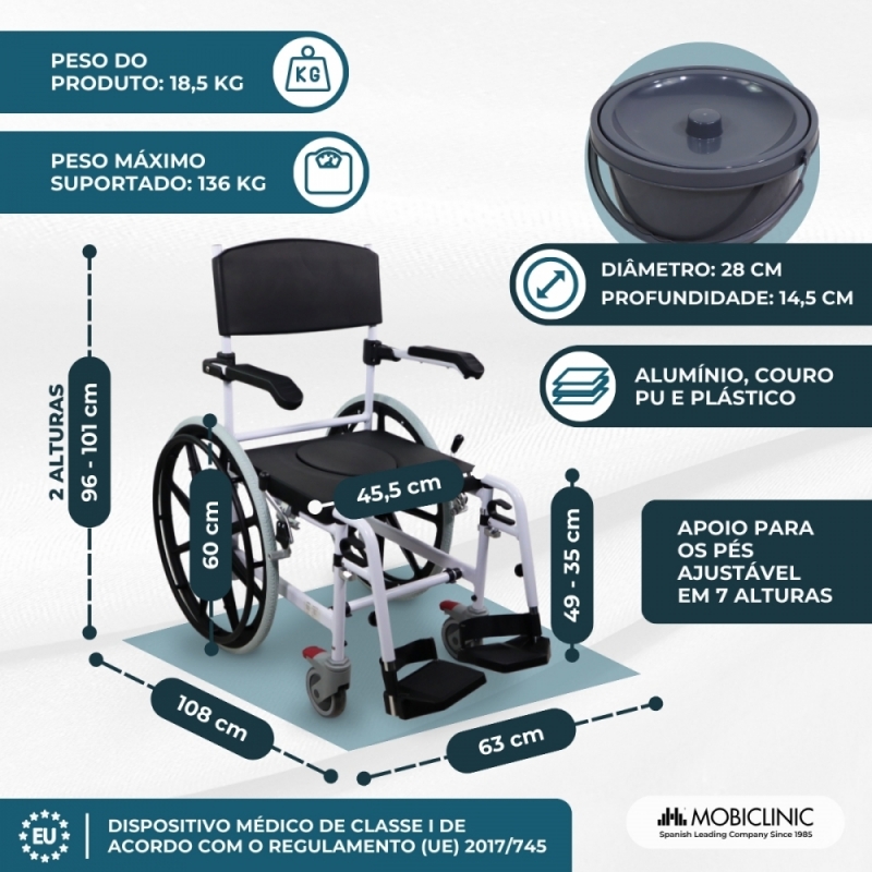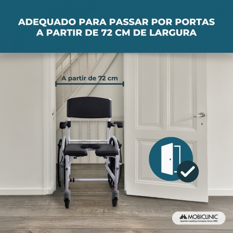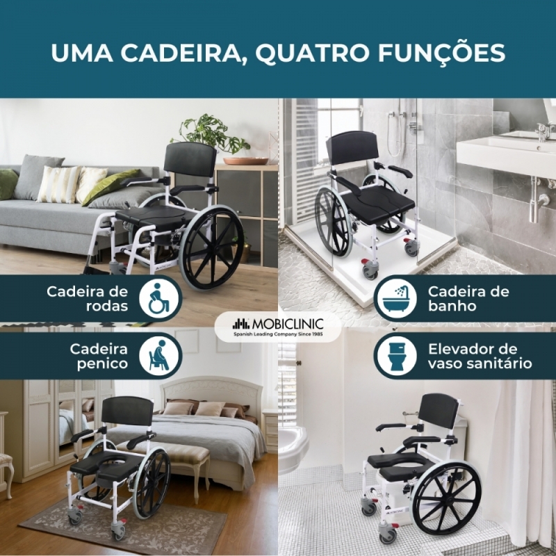 CADEIRA MULTIFUNÇÕES: Calígula é uma cadeira de banheiro que ajuda a facilitar o banho de quem precisa, permitindo que a cadeira seja colocada no chuveiro. Mas também é uma cadeira sanitária que possui um penico removível, o que melhora o conforto e a segurança, e também pode ser usada no vaso sanitário (com menos de 46 cm de altura e 45 cm de largura). Por fim, ela pode ser usada como cadeira de transporte para facilitar a locomoção para qualquer lugar.