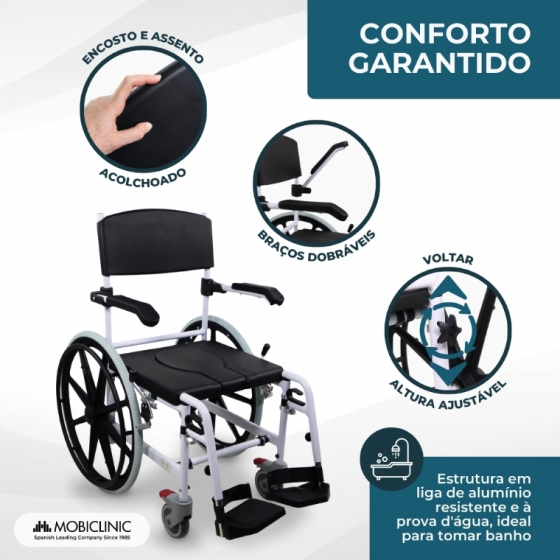 DESIGN FUNCIONAL: Possui assento acolchoado, apoios de braços e pés dobráveis para fácil acesso e conforto do usuário durante o uso. Esses itens são à prova d'água e de secagem rápida, ideais tanto para o banho quanto para a higiene diária. Além disso, a altura é ajustável de 93,5 a 101 cm.