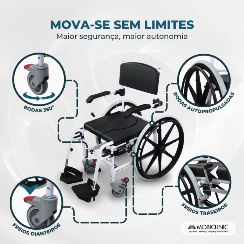 SEGURO E AUTOPROPELIDO: A cadeira de banho inclui freios nas rodas dianteiras e uma alavanca de freio nas rodas traseiras, garantindo a segurança durante o uso. As rodas traseiras são autopropulsadas, permitindo ao usuário se movimentar com maior independência e confiança em qualquer espaço. Este design combina conforto e autonomia, com foco na segurança do usuário.