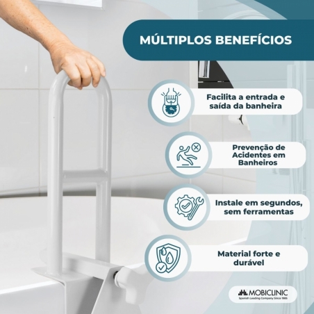 Adapta-se a banheiras com bordas lisas e planas, com largura mínima de 4,5 cm e máxima de 13,5 cm, adaptando-se a diferentes modelos de banheira. Sua alça ergonômica permite uma pegada firme e segura, mesmo com as mãos molhadas. Destaca-se principalmente por seu design robusto, capaz de suportar até 100 kg, sendo perfeita tanto para uso clínico quanto doméstico.