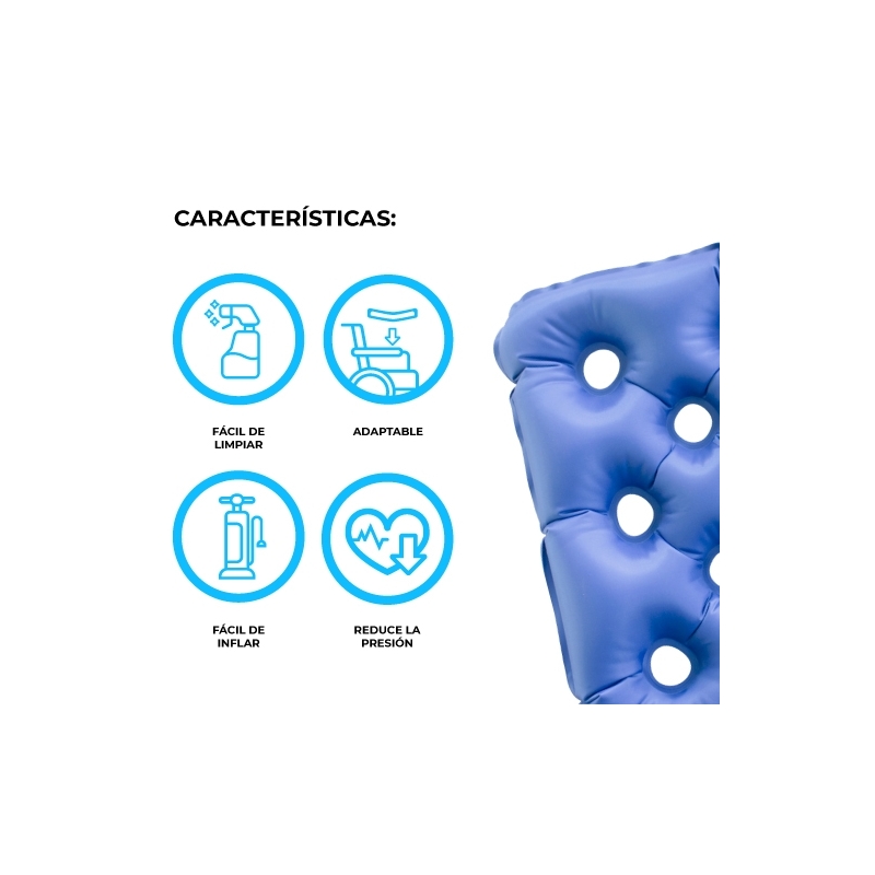 Este tipo de almofadas insufláveis funciona normalmente como um assento que se pode adaptar às medidas de cadeiras, poltronas ou cadeiras de rodas. Sua principal função é dar suporte às áreas do corpo lesionadas com úlceras, como: pés, orelhas, nuca, nuca, ombros, região lombar, sacro, calcanhares, tornozelos, cotovelos e joelhos.