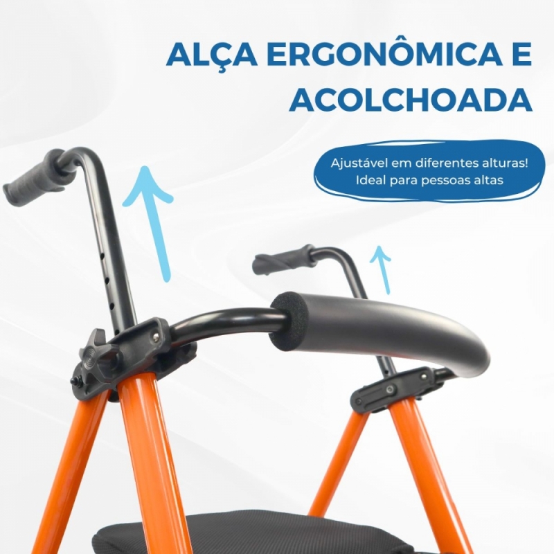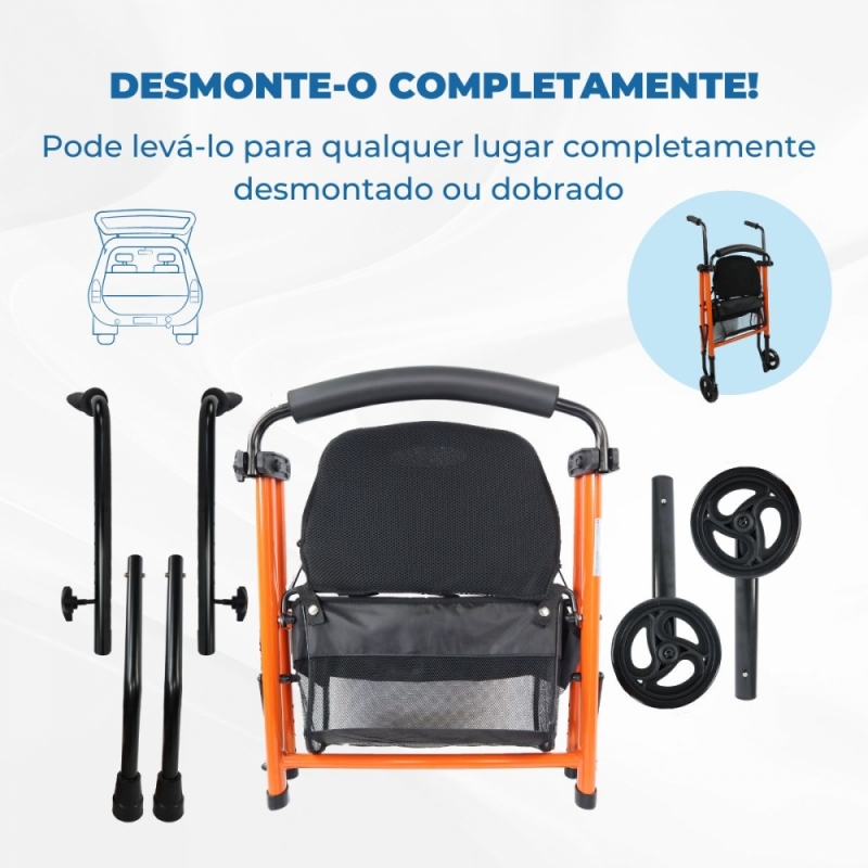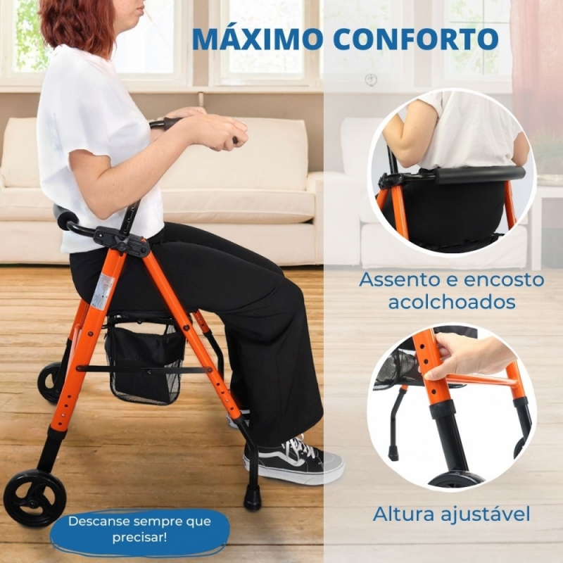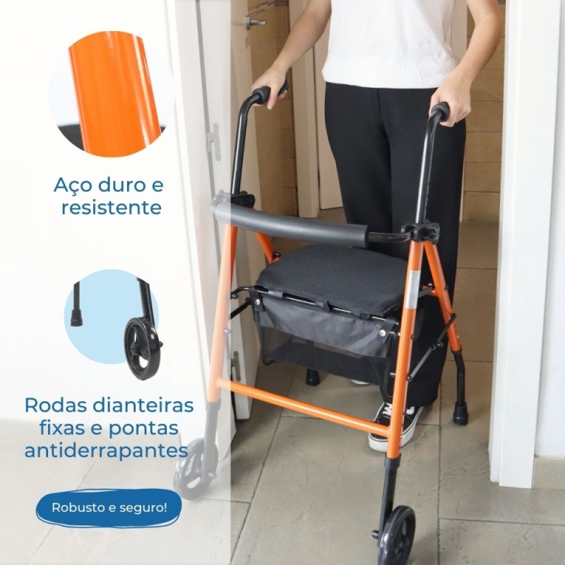 Este andador dobrável permite que você ajuste a altura para a adaptação total a cada usuário e dobrá-lo para facilitar o transporte e armazenamento do mesmo.