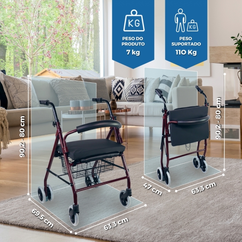 PORTAS E TRONCO : Este andarilho tem uma largura total de 63,3 cm, podendo passar por portas de largura padrão de 72,5 cm. Além disso, como este andrilho dobrável mede apenas 47 cm, pode ser transportado no porta-malas de um veículo do tipo Volkswagen Polo. Certifique-se das medidas das portas e do veículo para verificar se está adequado a si.